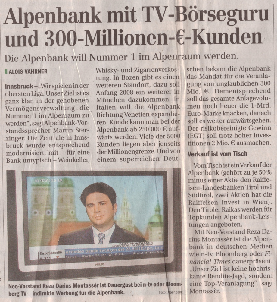 Tiroler Tageszeitung September 2007 - AlpenBank mit TV-Börsenguru und 300-Millionen-€-Kunden - Dr. Reza Darius Montassér