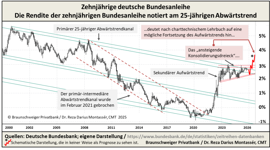 Abb. 15) Die Rendite der zehnjährigen Bundesanleihe notiert am 25-jährigen Abwärtstrend