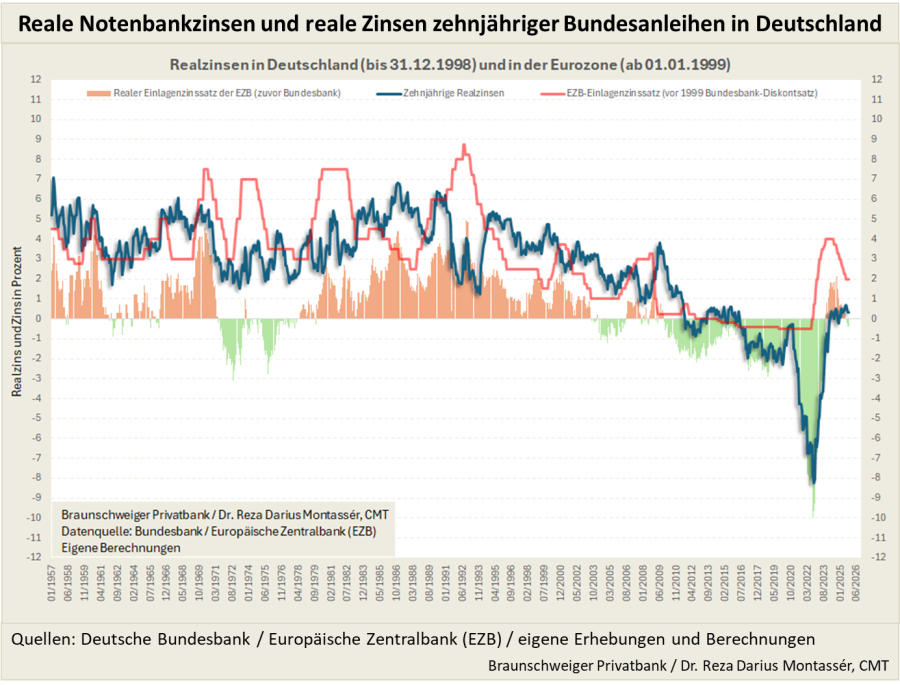 Abb. 4) Reale Notenbankzinsen und reale Zinsen zehnjähriger Bundesanleihen in Deutschland seit 1957